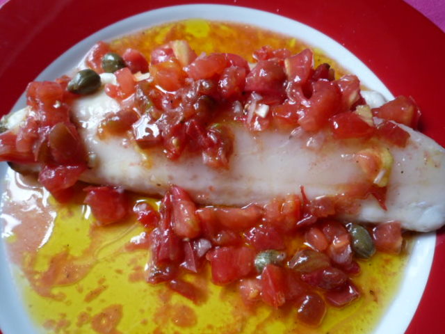 Préparez la sauce à l'avance, coupez des tomates mûres du jardin avec le goût extraordinaire! en petits dés, ajoutez un peu de sel et du poivre, une très bonne huile d'olive très douce et un peu de câpres et du jus de citron, laissez mariner un peu. Poélez juste le poisson et servez.....