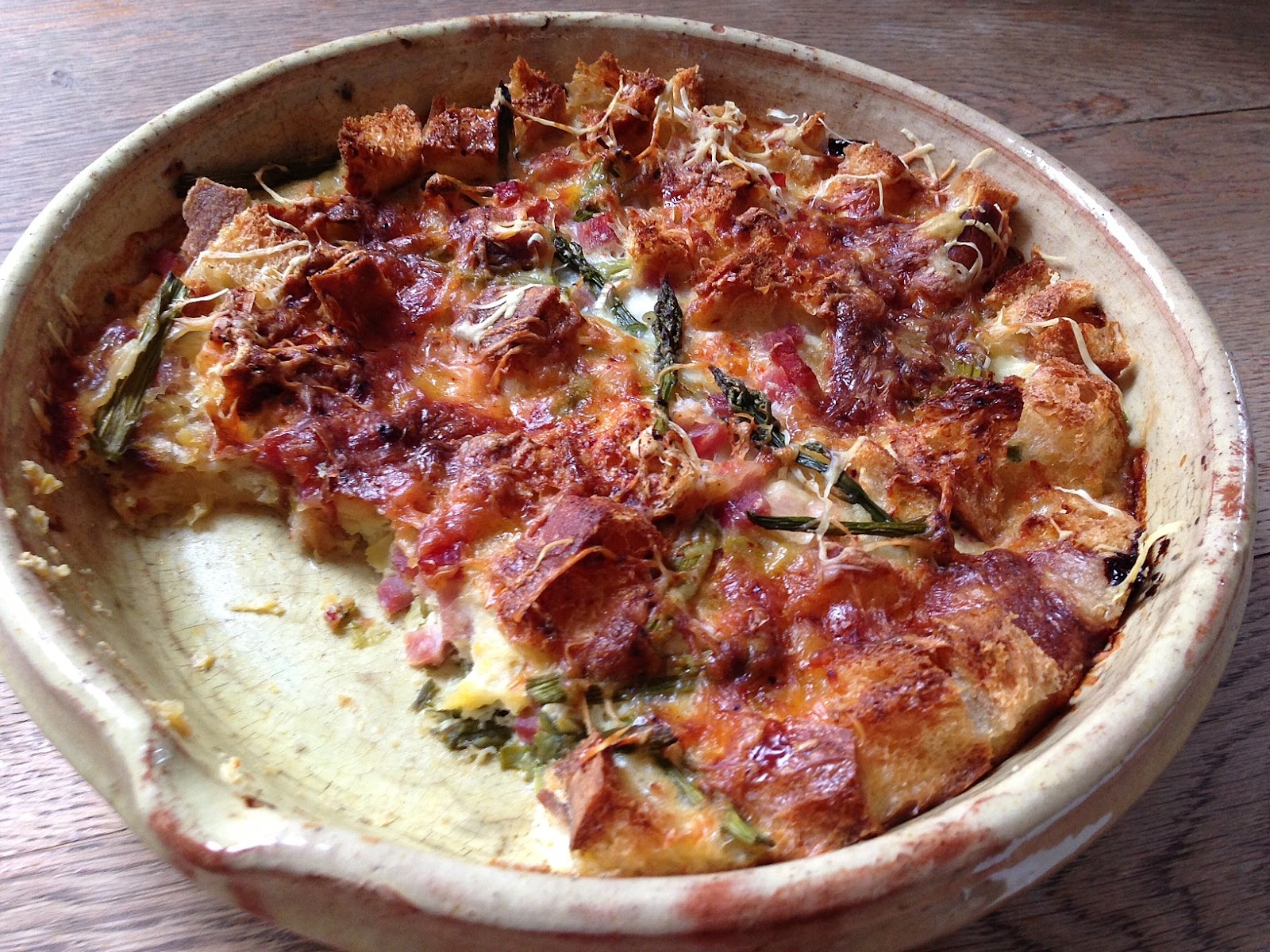 Man kann die Strata gut vorbereiten und ungekocht im Kühlschrank einen Tag aufbewahren, was noch besser ist, weil das Brot sich dann vollsaugt.