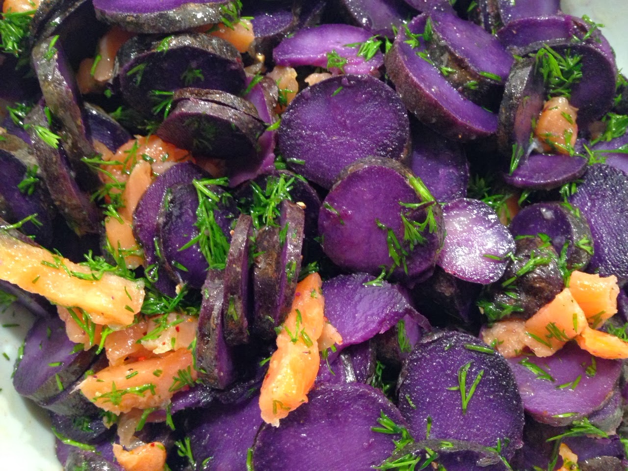 Une salade qui a de la patate! Il vous faut juste des pommes de terre "vitelotte", un peu de saumon fumé bio, de l'aneth, de l'huile d'olive, un peu de vinaigre, citron, sel et espelette et voilà!